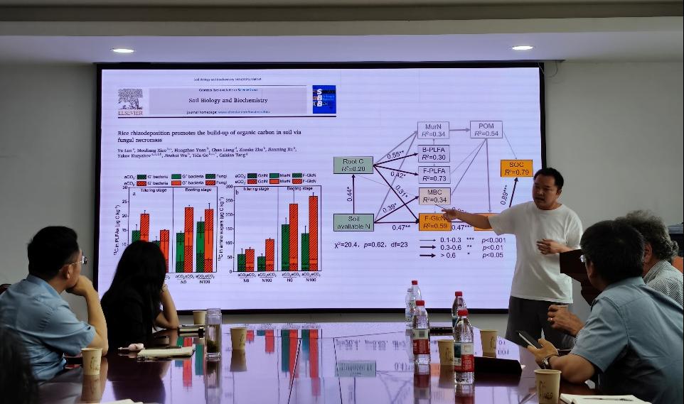 随后,罗煜副教授以其团队近15年发表在国际权威期刊《Soil Biology and Biochemistry》上的论文为例,介绍了其在微生物调控植物根系-土壤-有机碳互作过程及驱动机制的研究进展。